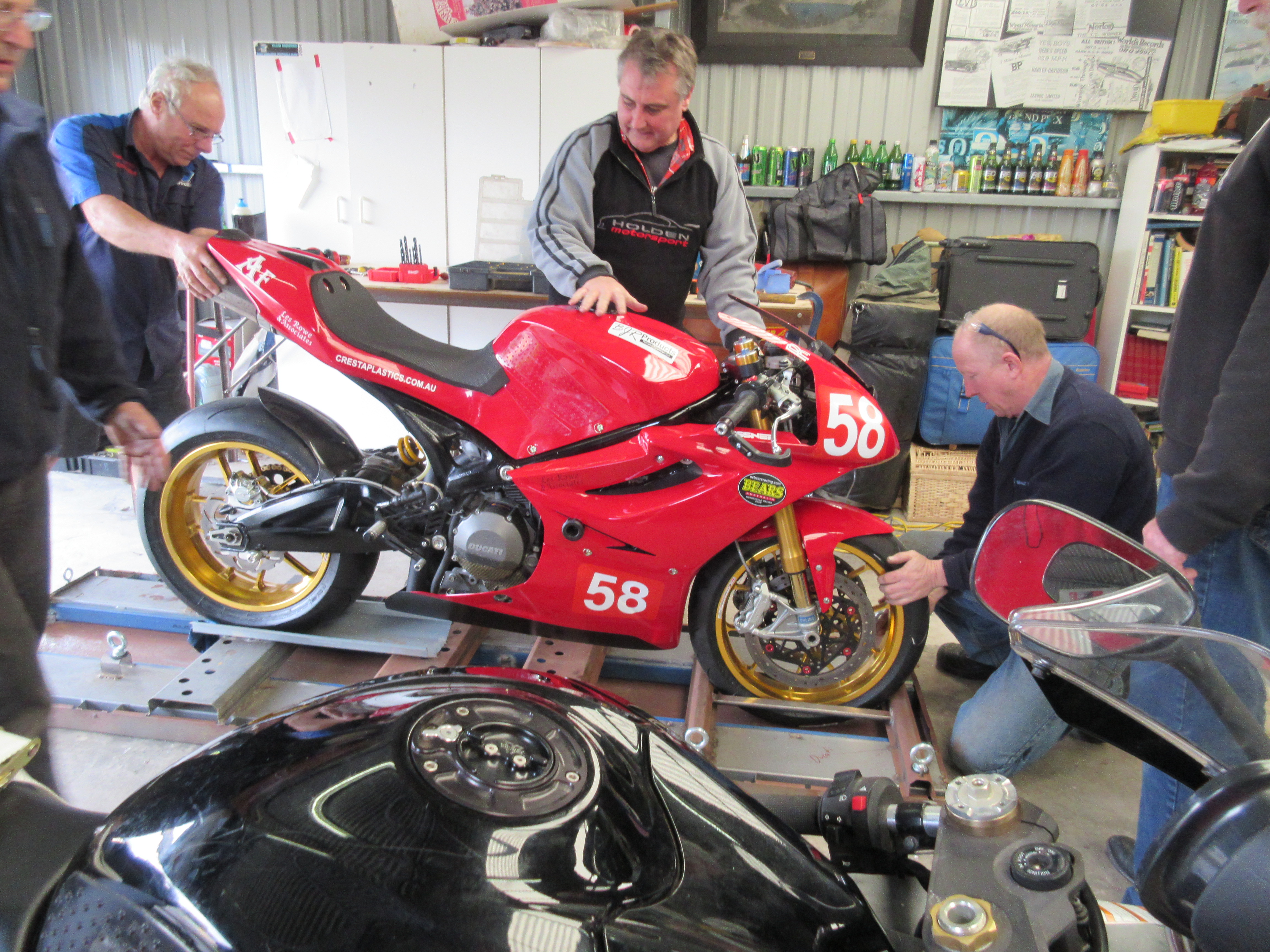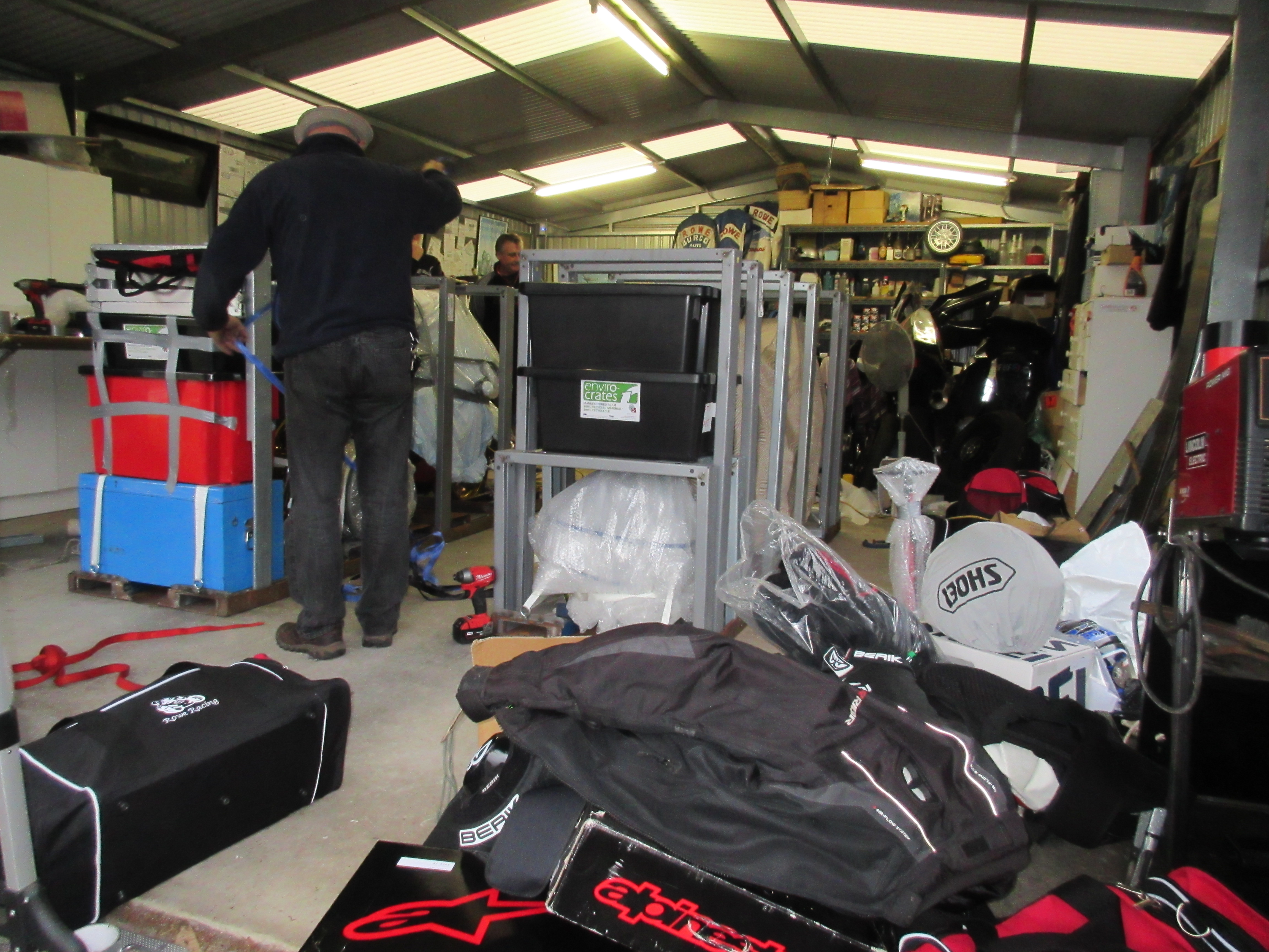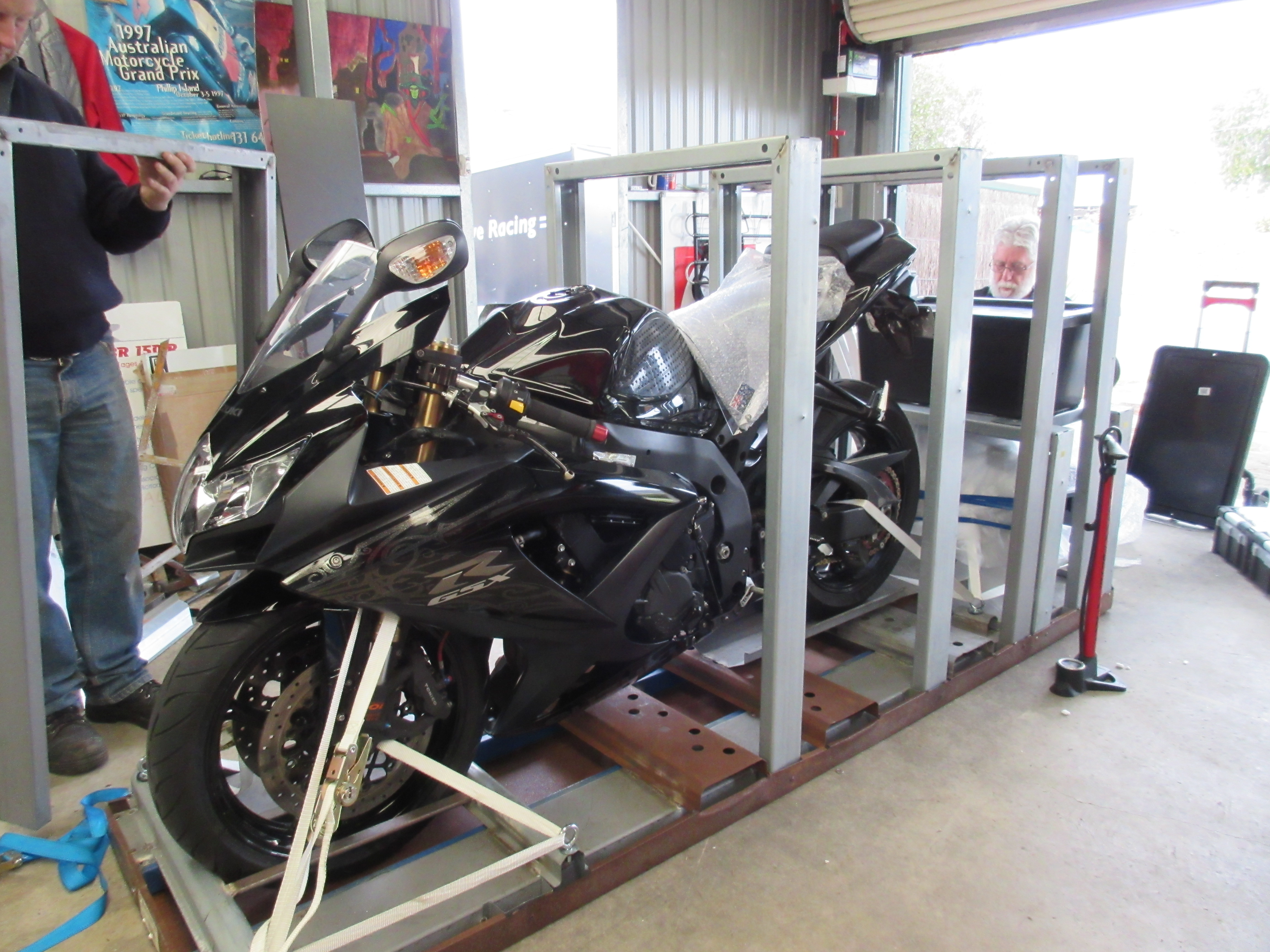 With the help of family and friends, the crates were welded together and strengthened by extra steel plates. The bikes were firstly strapped down, making the construction of what is essentially a cage much easier. From there, all the gear, spares, tools and basically everything but the kitchen sink was stacked around the padded bikes to ensure minimal movement when being loaded.